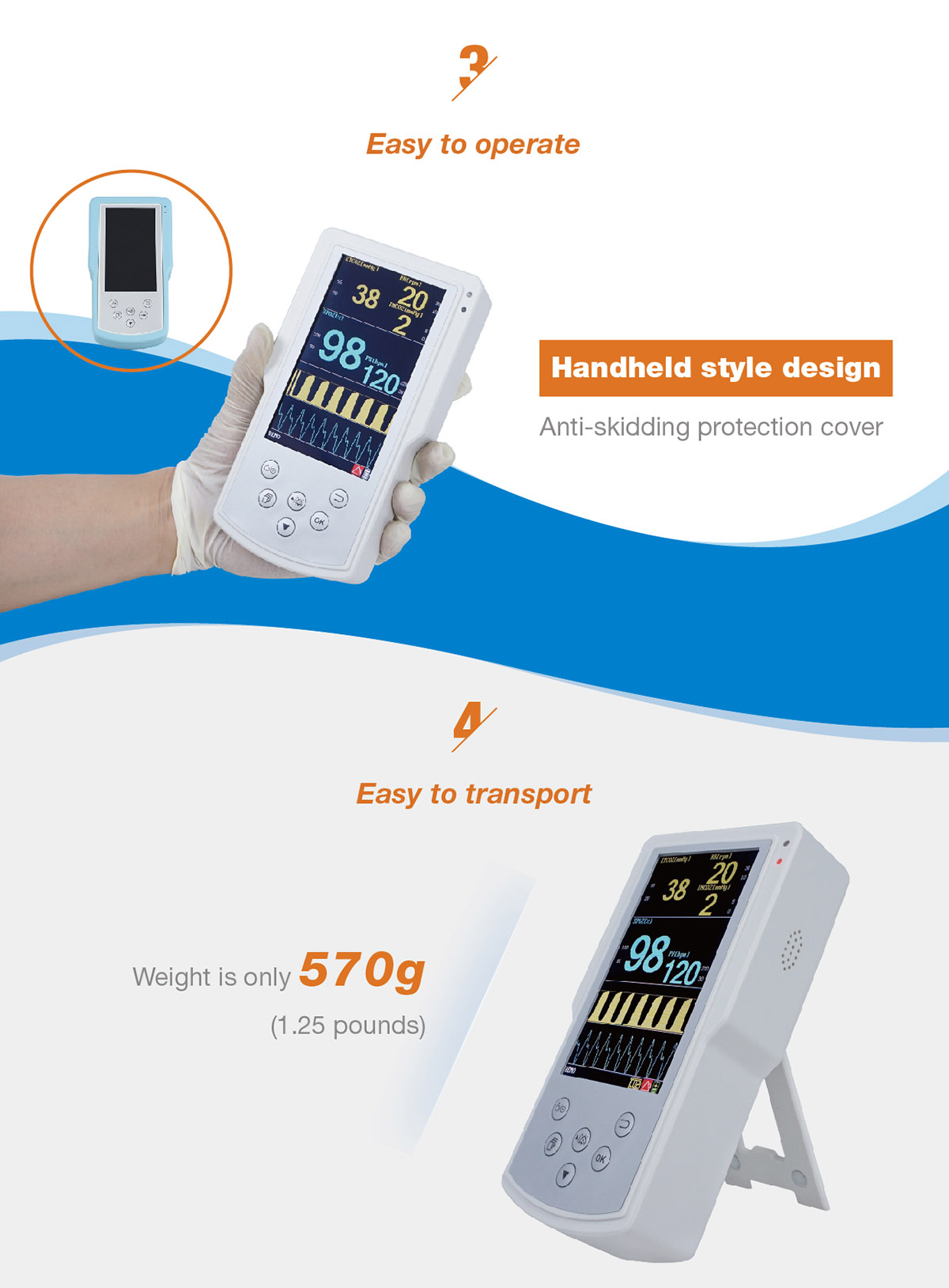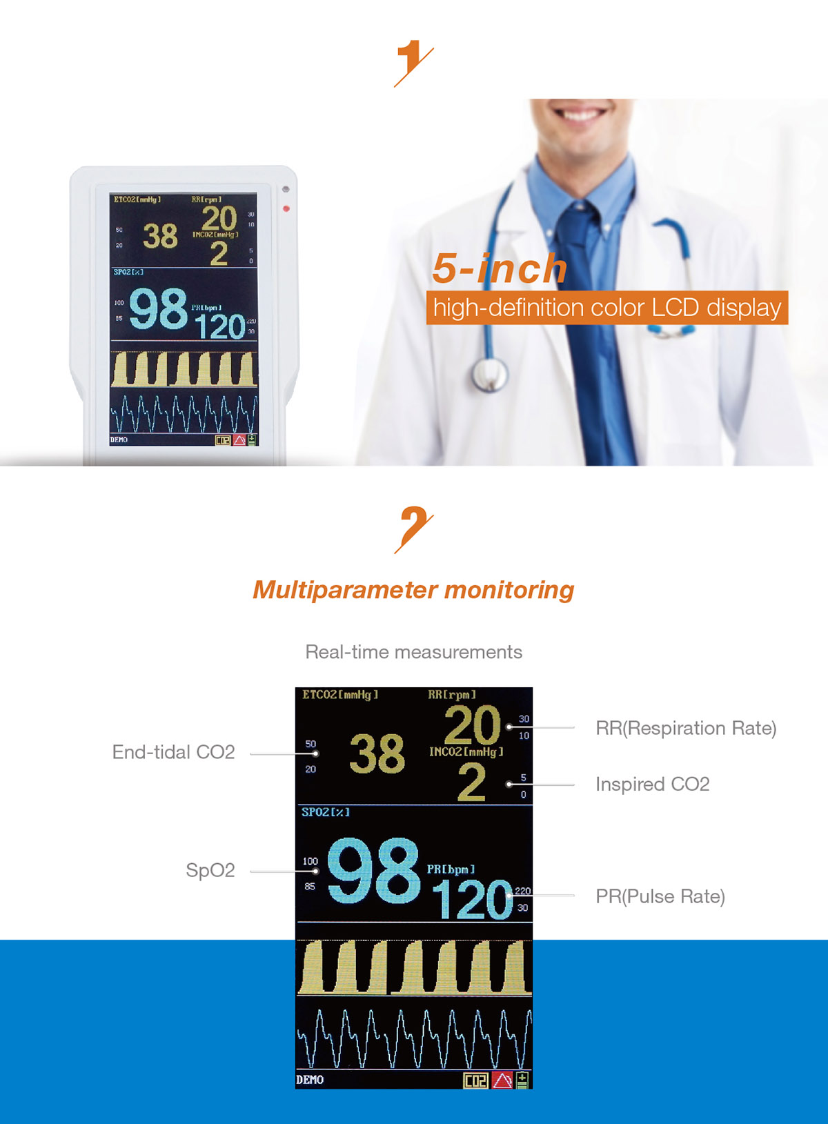 Measure Range:SpO2: 0~100%Pulse rate: 35~254bpmEtCO2: 0~150mmHgRespiratory rate: 3~120bpmMeasure Accuracy:SpO2: ±2% (70~100%)Pulse Rate: ±2 or ±2bpmEtCO2: ±5% of readingRespiratory Rate: ±1breathSize:Demension: 192x106x44mmWeight: 650gElectrical Safety:Adapter Input: AC 110V/220V, 50/60HzAdapter Output: DC 12V, 2AInner Battery: Rechargeable Lithium Battery, working for 10 hoursCharge time: 4 hoursStandard Parameters:a) Capno-I: EtCO2b) Capno-II: EtCO2 + SpO2