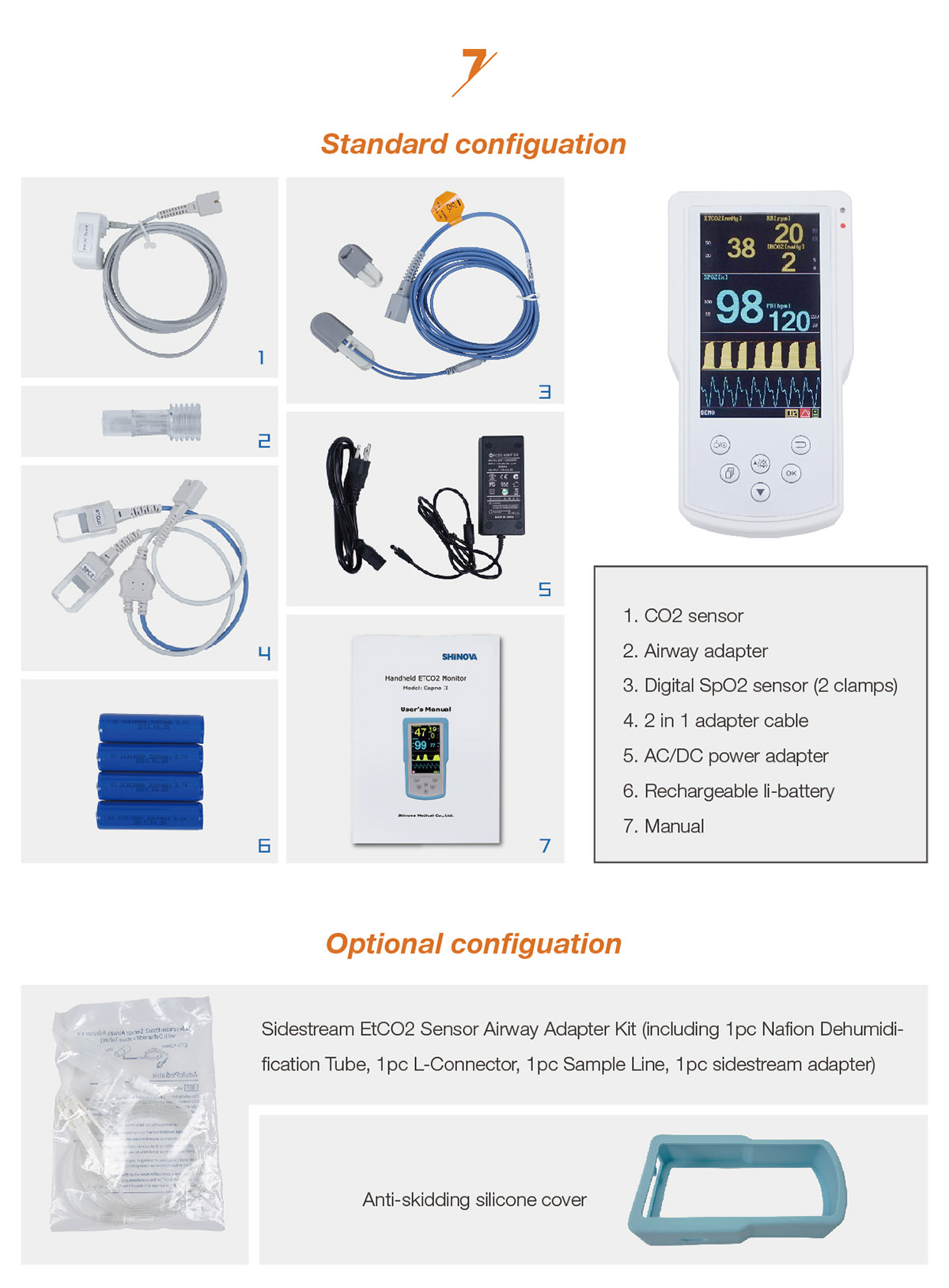 Standard Configuration:Main unit, Sample line, Nasal sample line, CO2 adapter, SpO2 sensor, L-connector, Power adapter.Optional Configuration:Mainstream CO2 Sensor