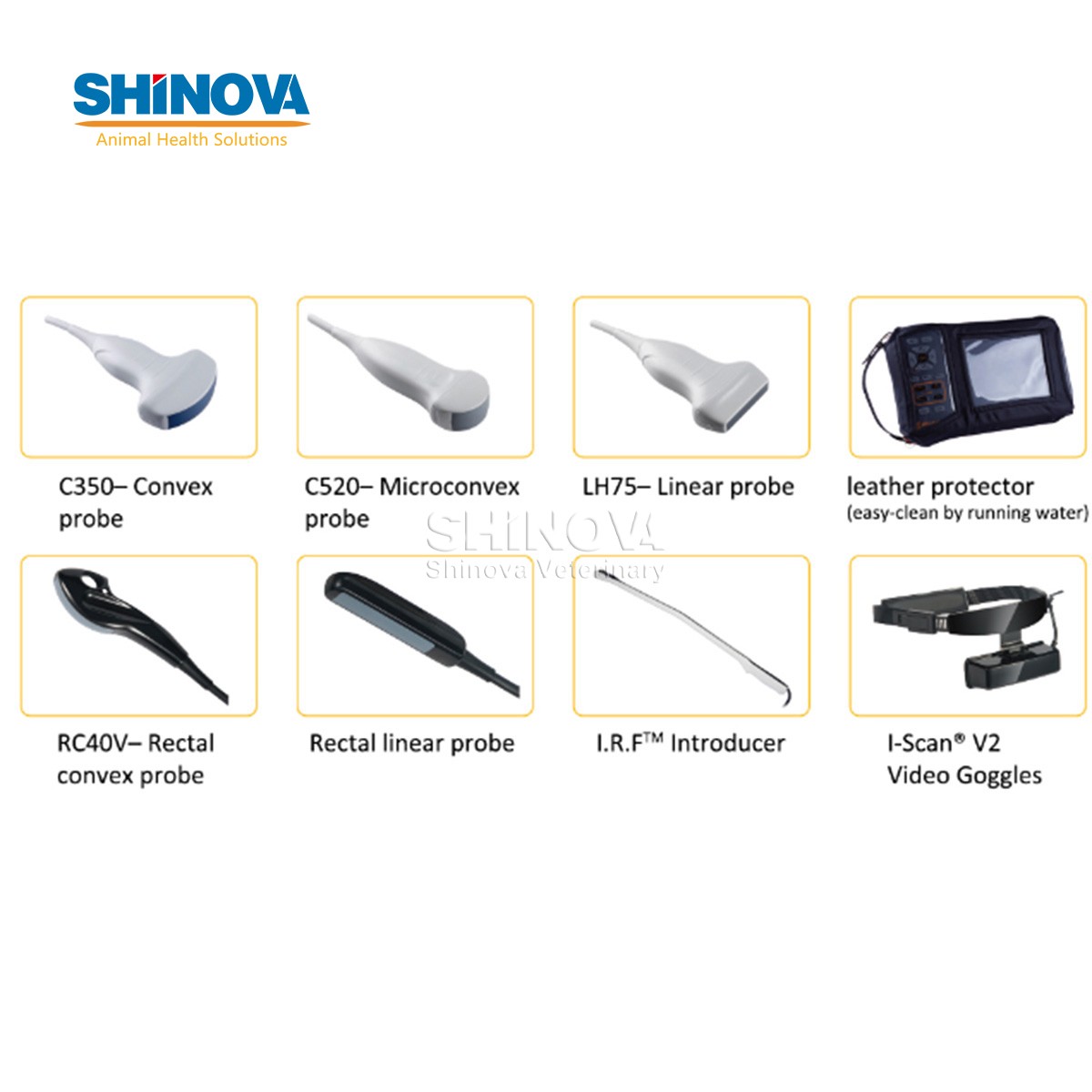 Rectal convex probe, high frequency linear probe, Micro-convex probe, Abdominal convex probe, Li-ion high-power-capacity battery, Car Charger, Battery charger, Video goggle, Wrist LED Monitor.