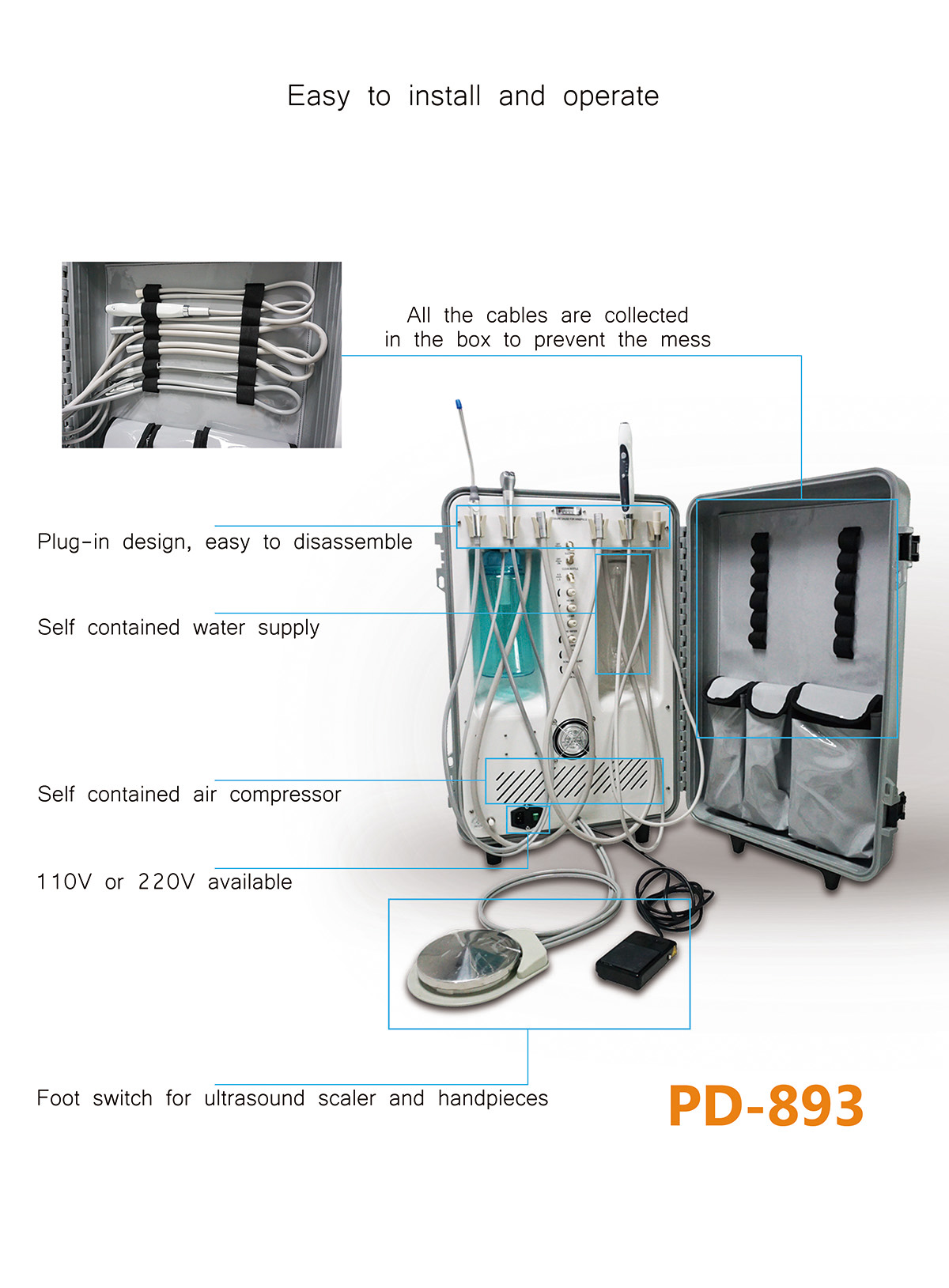 COMPLETE FUNCTION: The unit consists of related operation system inside the dental treatment unit, such as air system, water system, suction and drainage.
