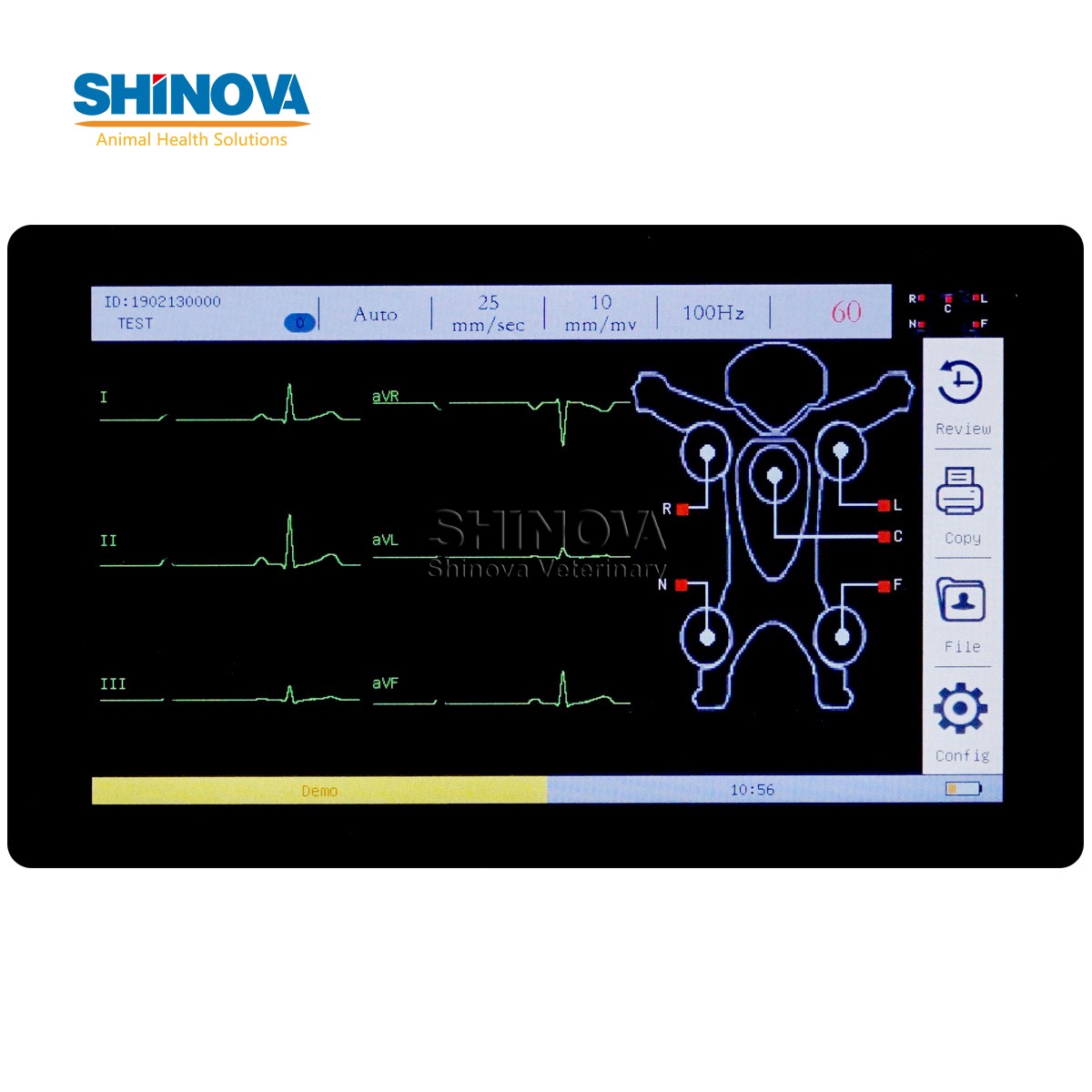 Veterinary 5-lead clip ECG cable, Recording paper (roll 80mm*20m), Paper roller, Power cord, Fuse, Ground cable, User manual.